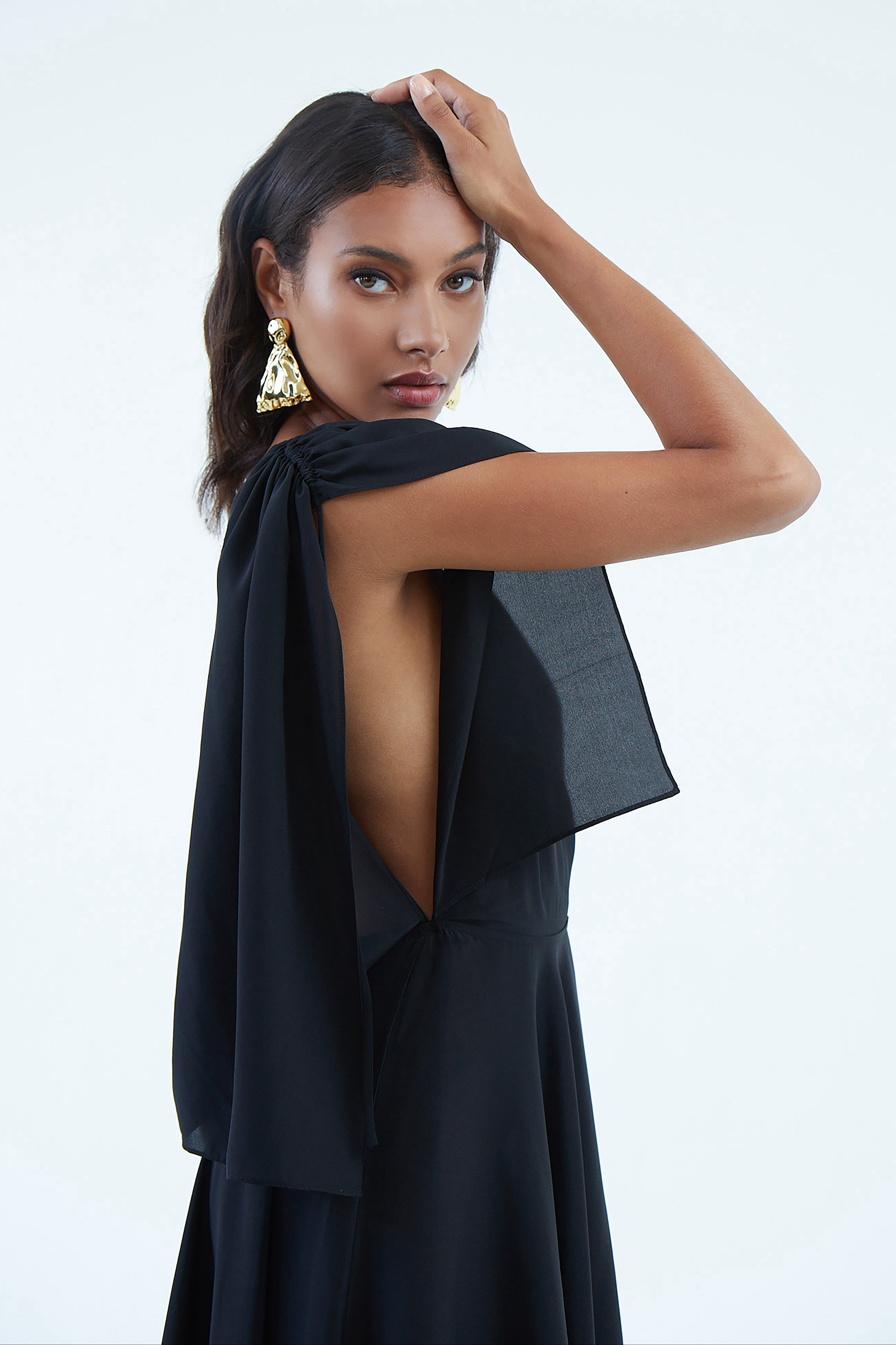 Slip into this dreamy wrap dress and sway. Its backless design adds a layer of seduction that's elegant and daring. An adjustable back strap guides how the fabric hugs you. Wide, silky sleeves hang loose or scrunch up to your shoulders using a drawstring. Let it be whimsical or sophisticated. Wear it casually to bring out your inner bohemian, or with heels for a night out in the city.