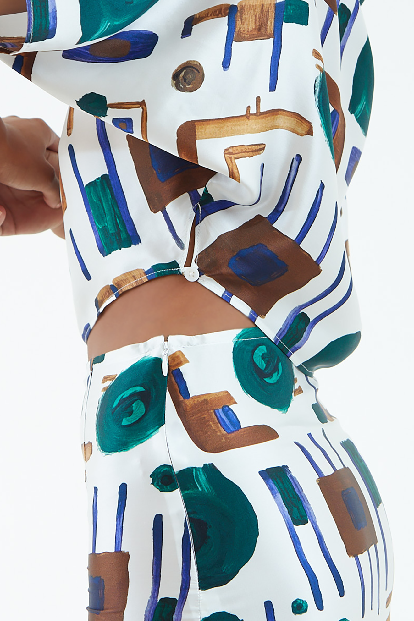 A refined crop top featuring a clean boat neckline, elbow-length dolman sleeves, and subtle side waist buttons for a flexible fit. Crafted from luminous silk in our custom NiLa print, this top offers effortless movement with an artful drape.